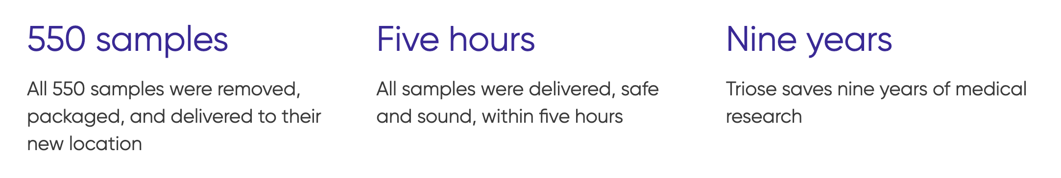 By working closely with the medical center, pulling together outside resources, and doing what many of our competitors can’t – tapping into our expertise and relationships with couriers — Triose made it happen. All 550 samples were removed, packaged, and delivered to their new location, safe and sound, all within five hours.